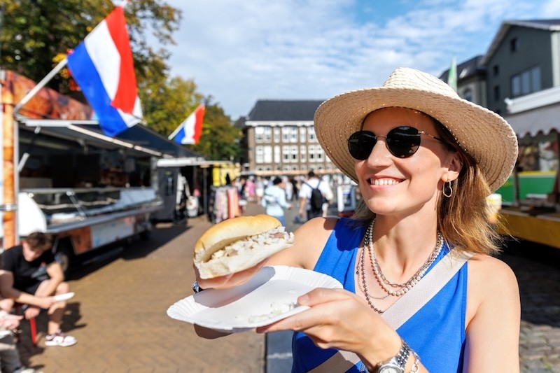 Probieren Sie den berühmten rohen Hering direkt im Hafen von Scheveningen, Volendam, oder Den Oever. Serviert mit Zwiebeln und Gurken – echt ein Muss für Holland-Fans.