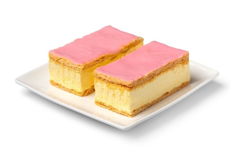 Ein Tompouce, oder auch tompoes, ist ein rechteckiges Blätterteiggebäck, gefüllt mit Vanillecreme und glasiert mit rosa Zuckerguss. Oft mit Sahne oben drauf oder in der Mitte.