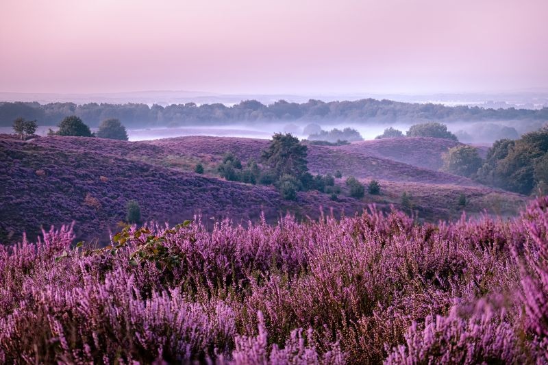 Der angrenzende Nationalpark Veluwezoom besticht durch seine hügelige Landschaft und ist vor allem im Spätsommer ein Erlebnis, wenn die Heideflächen in kräftigem Violett blühen.
